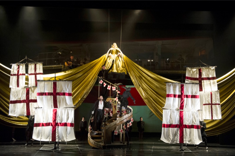 That upper level is where the orchestra sat for most of the opera, a reminder if any were needed of the habit in Elizabethan theatre of having the musicians at a higher level. Costumes are Elizabethan, and this extraordinary creation by Damon Albarn and director Rufus Norris is a sight not to be missed. The music by Damon Albarn, conducted and supervised by Stephen Higgins, mixes a twenty-first century popular style with musical ideas from the sixteenth and seventeenth century. In putting on this imaginative show the ENO is offering opera to a wide audience, and my only complaint is that they have abandoned their usual practice of providing surtitles. It was not always easy to understand the words, particularly the utterances of Edward Kelley, but the synopsis in the programme expressed everything with excellent clarity — so be sure to buy a programme.